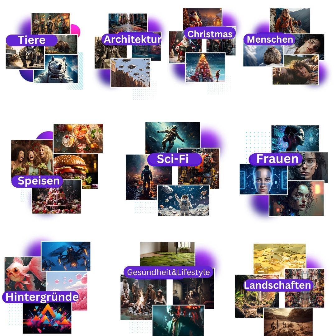Wir bieten Ihnen die einzelnen Bildersammlungen zu je 300 KI-Bildern zu den o.g. Themen zu je 3,90€